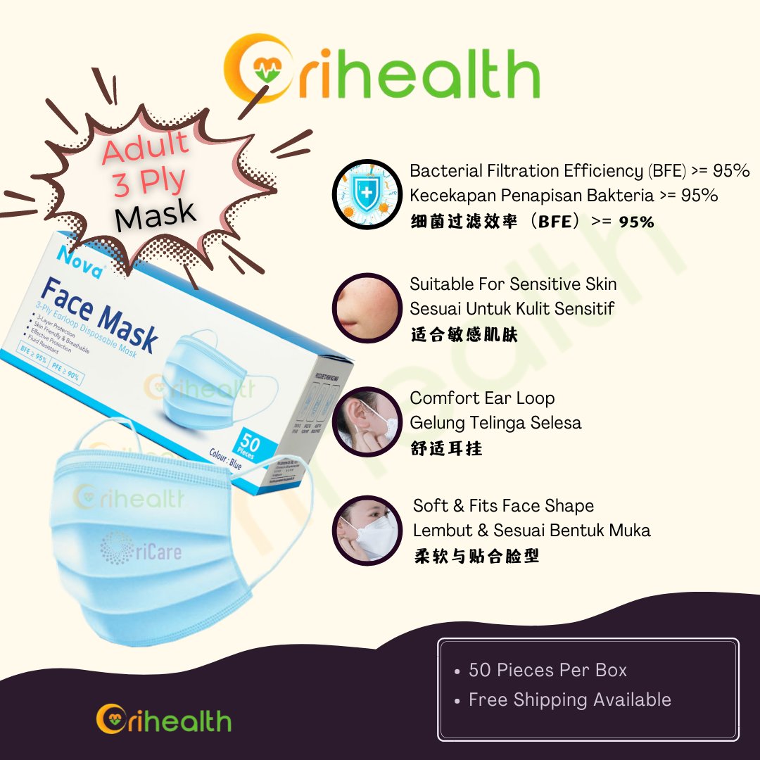 Nova 3-Ply Earloop Disposable Adult Face Mask provides you a perfect balance of protection and comfort. It is made from high quality materials and with effective three-layers protective barrier. It keeps you safe and protected by filtering out harmful germs, viruses, and fine particles.