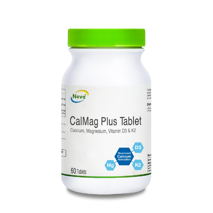 Nova CalMag Plus is a 4-in-1, combination of calcium and other nutrients like vitamin D3, vitamin K2, magnesium and manganese to maximise calcium absorption.