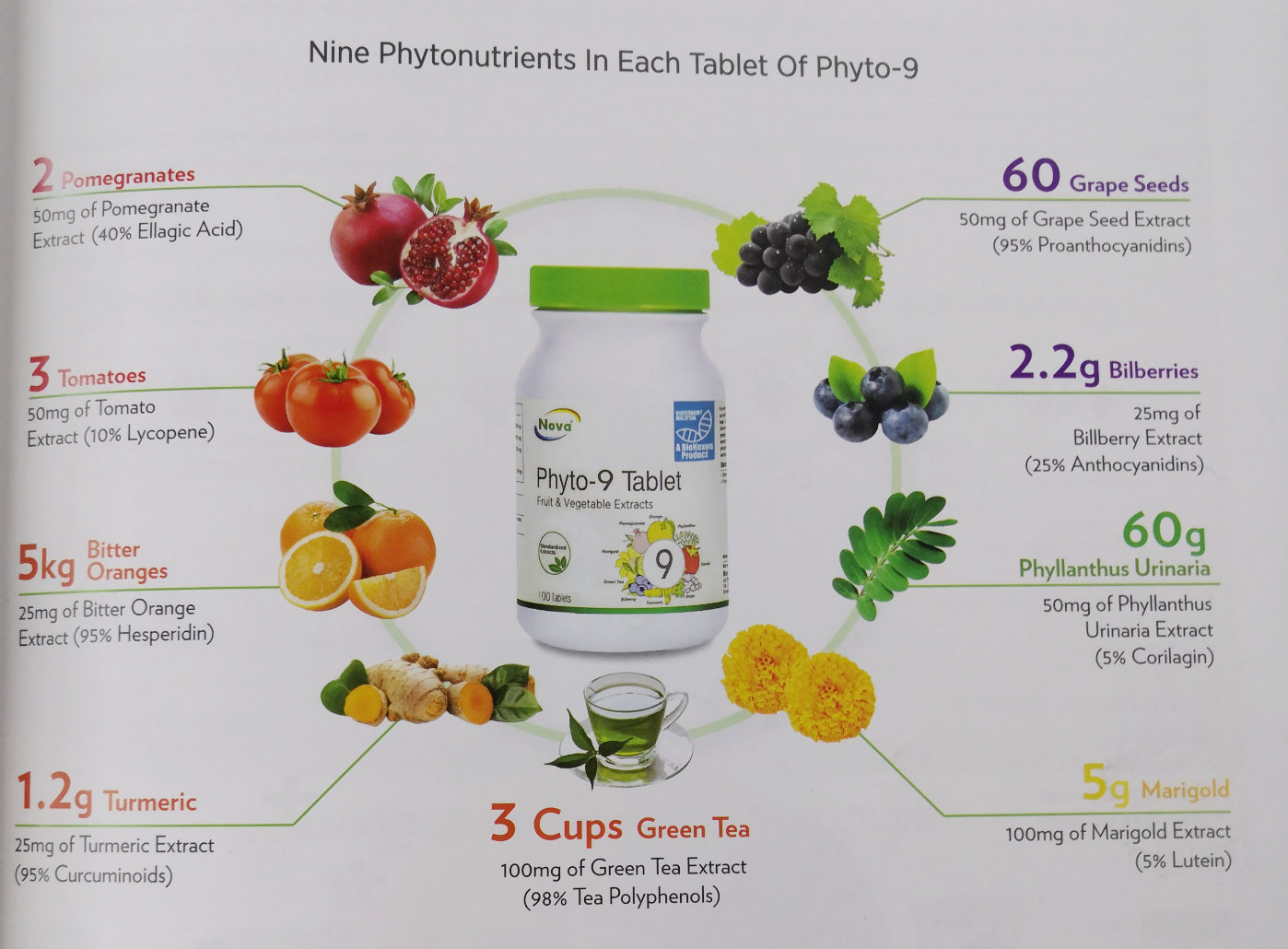 Health authorities and experts globally recommend 5 to 9 servings of fruits and vegetables of different colours daily. Each colour represents different plant nutrient that functions as antioxidants and nutrients for our body. Phyto-9 is a combination of 5 different colours of fruit and vegetable extracts with effective dosage and standardized extract.