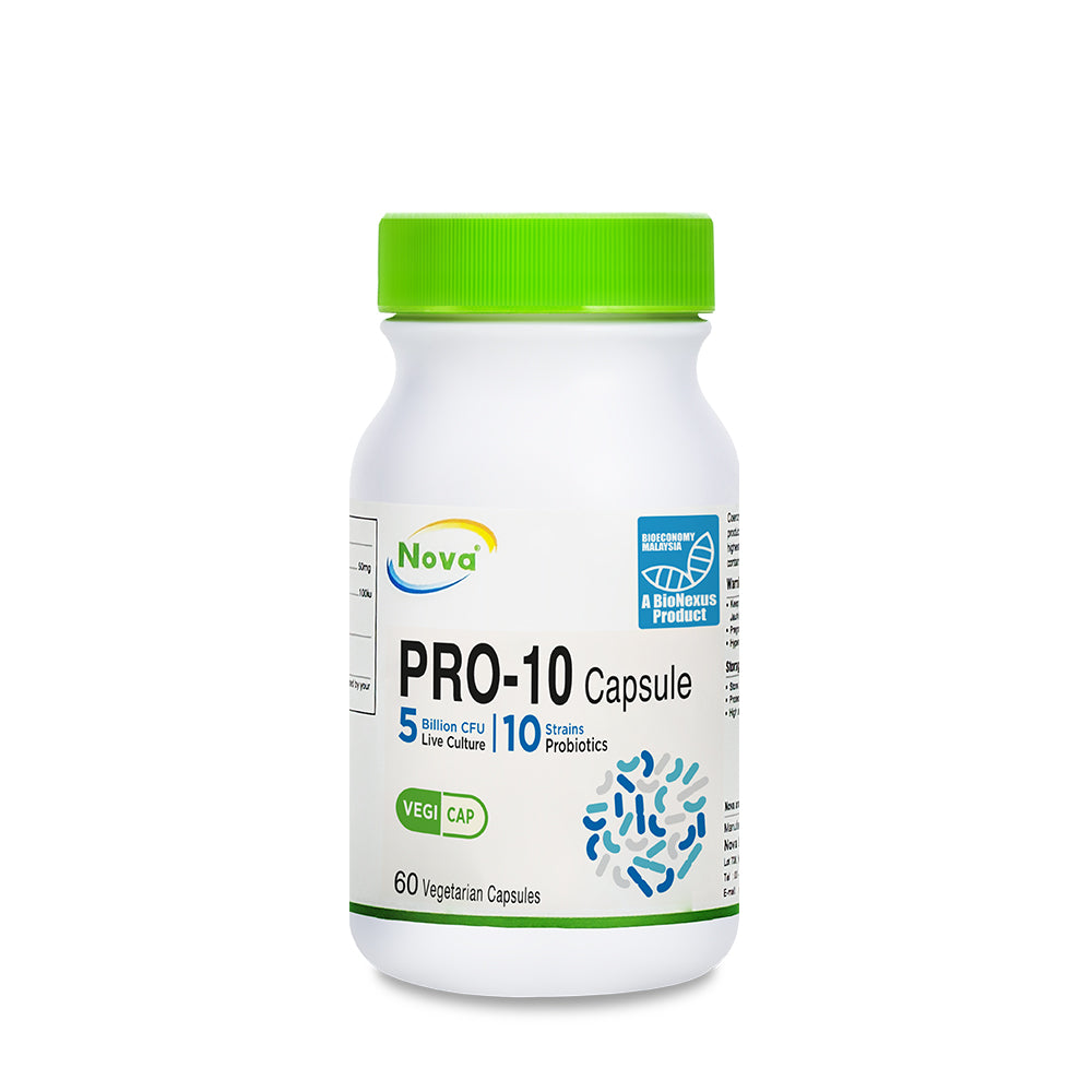 Pro-10 contains a high dose of multi-strains live probiotics specially selected to produce an optimal protection effect. The probiotics are specially selected to be stable against gastric juice and bile fluids, tough enough to reach your gut alive and flourish. Nova’s belief in quality ensures that each vegetable capsule delivers at least 5 billion CFU of live cultured probiotics to your gut, enabling you to achieve a healthy, balanced gut environment.