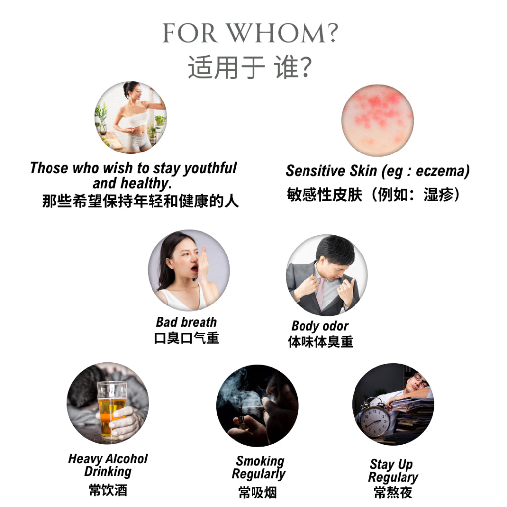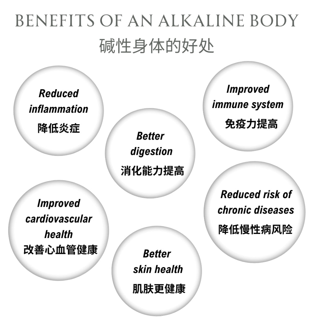 A synergistic drink for effective alkaline cleansing, regulate body acidity and alkalinity, complexion and immunity.