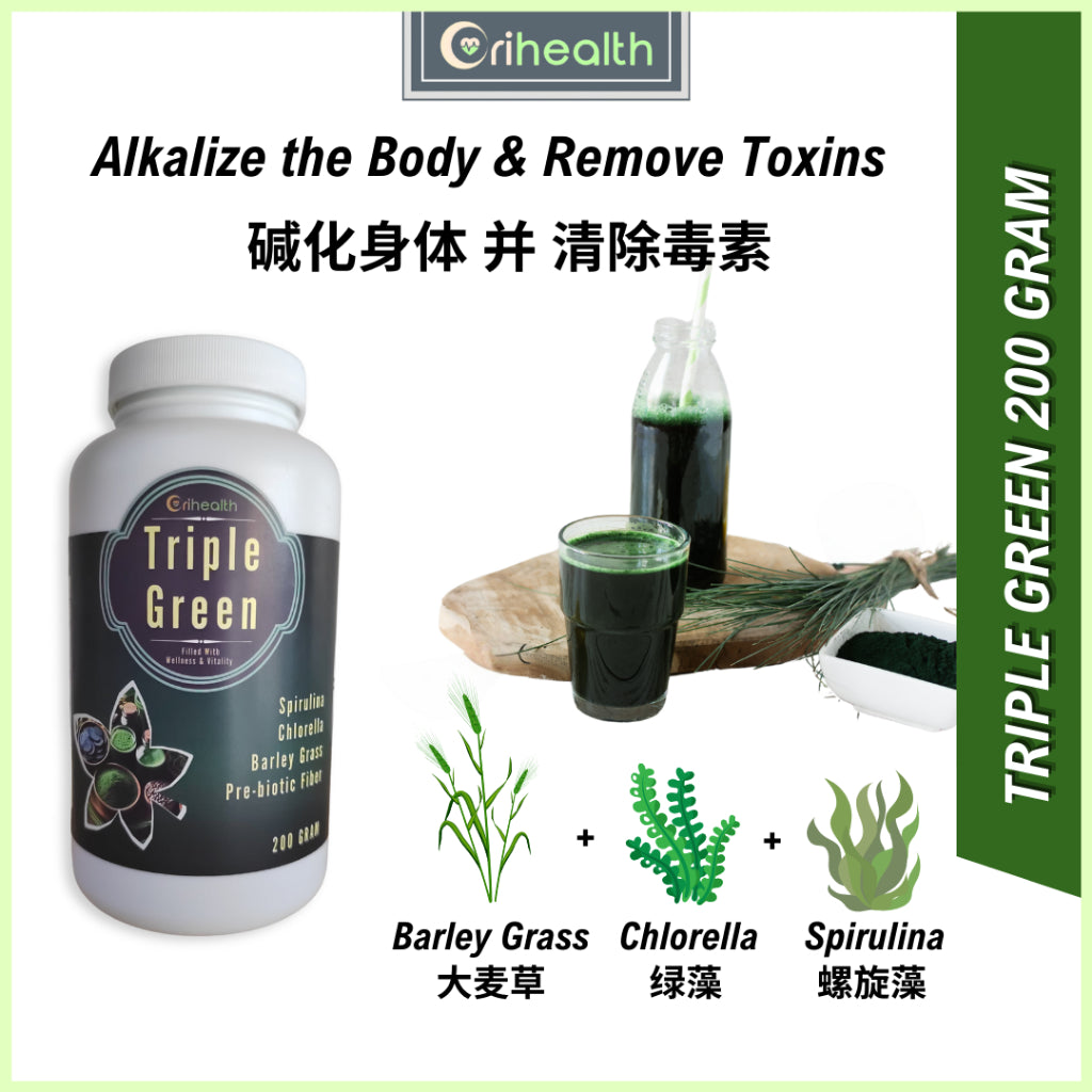 Orihealth Nova Alkalising Triple Green is a super green food formula of pure Spirulina, Chlorella, Barley Grass and Soluble Prebiotics Fibers.